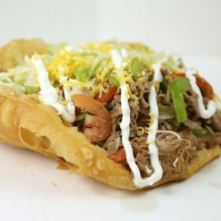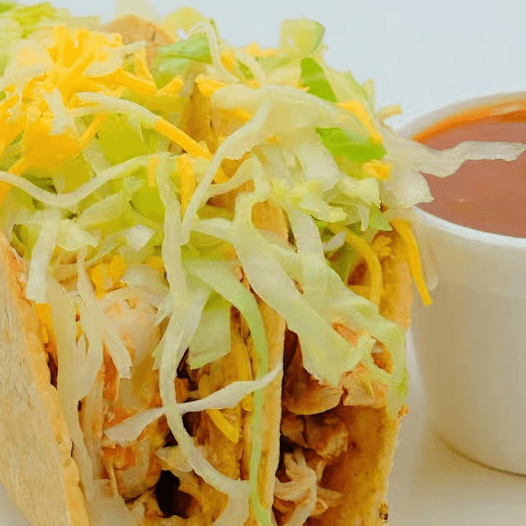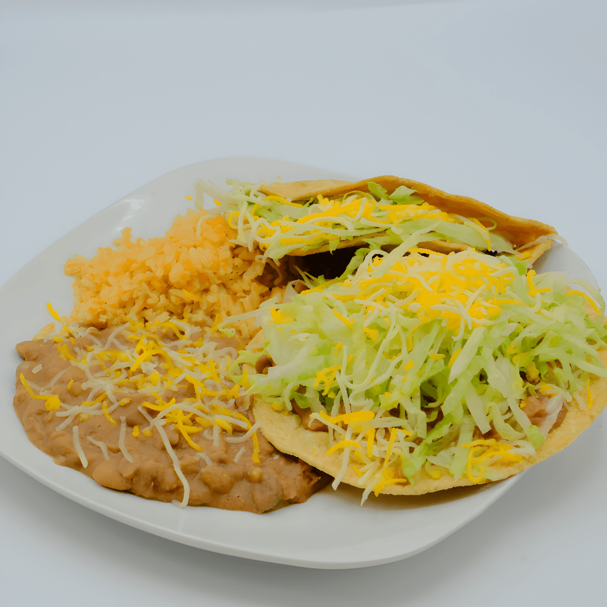 1 hard shell tostada with beans, cheese, and lettuce. 2 beef tacos with cheese and lettuce. Includes rice and beans.