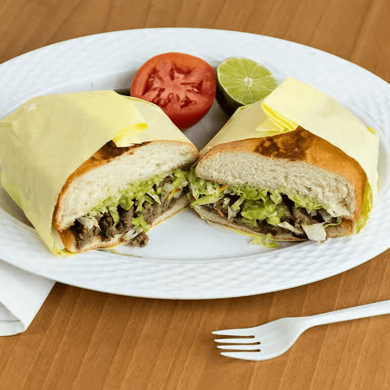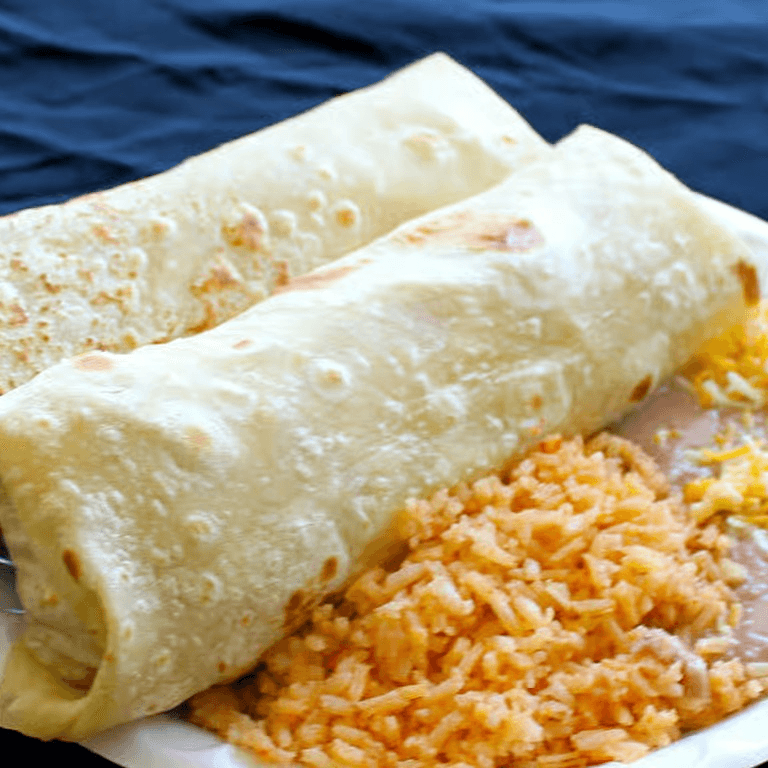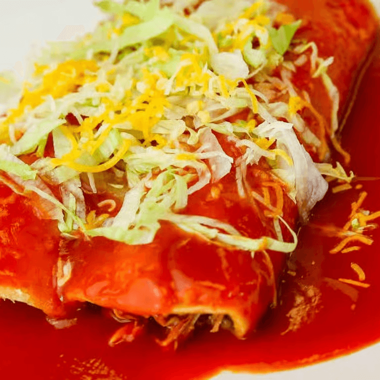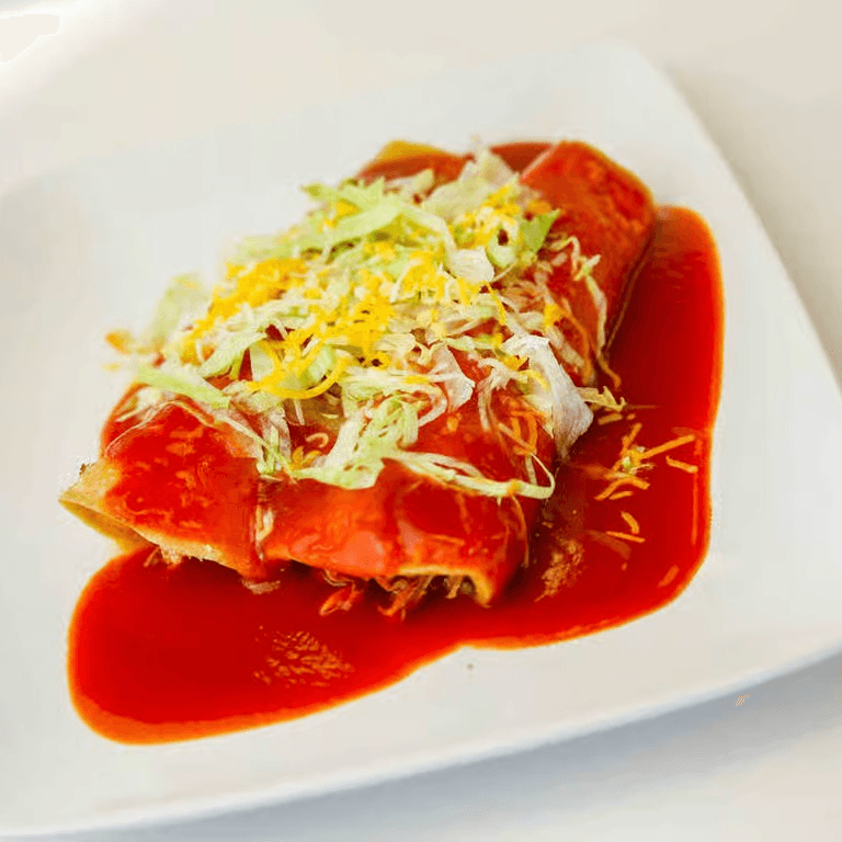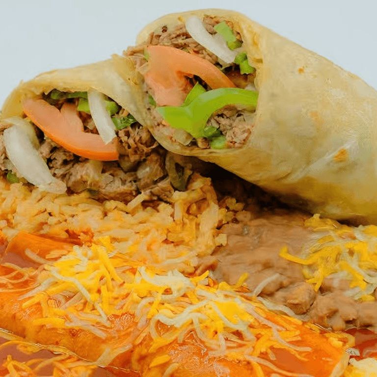 Beef Burrito: shredded beef, onions, tomato, and bell pepper. Enchilada: enchilada sauce, cheese, and lettuce. Includes rice and beans.