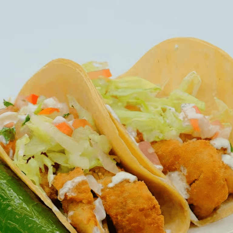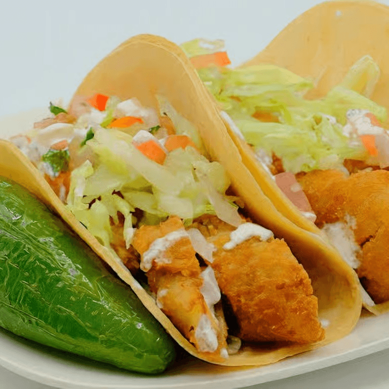 Tartar sauce, lettuce, pico de gallo, and lemon. Served with rice and beans.