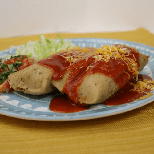 Cheese, enchilada sauce, lettuce, and pico de gallo. Choice of flour or corn tortillas. Served with rice and beans.