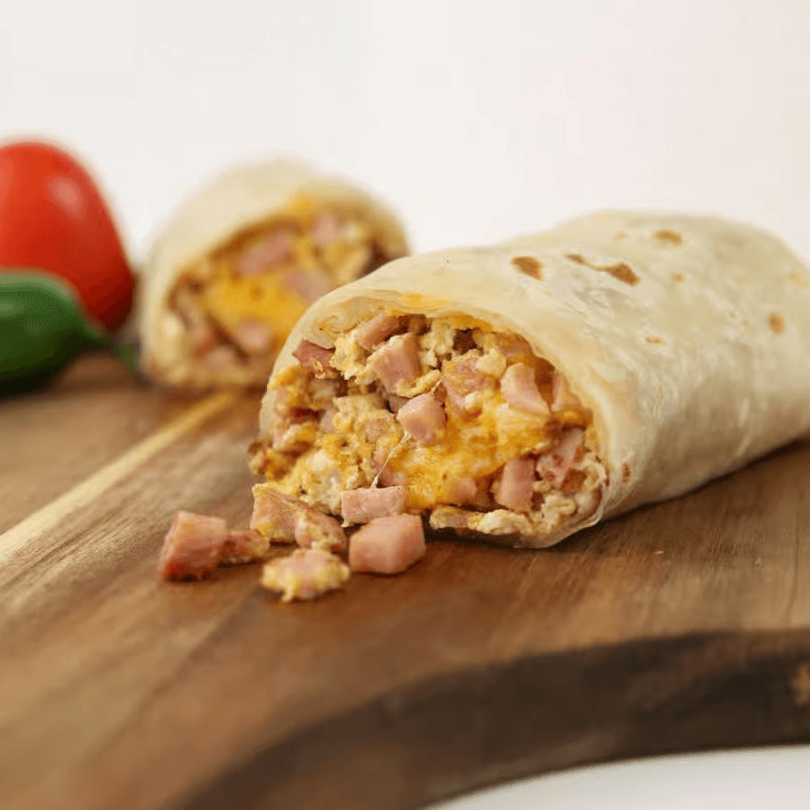 Delicious ham with egg covered with cheese and cream, accompanied by beans and rice, and flour or corn tortillas.