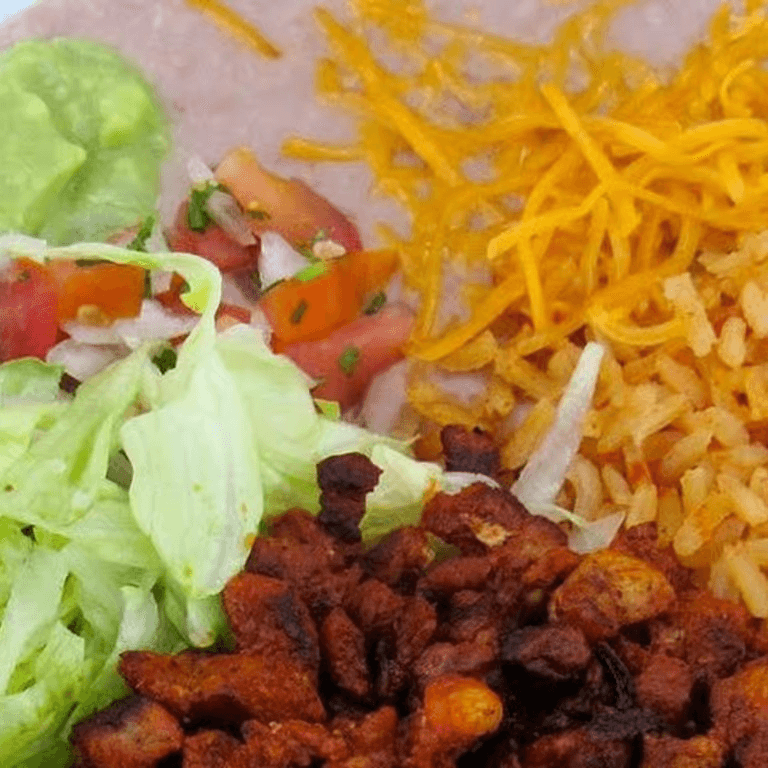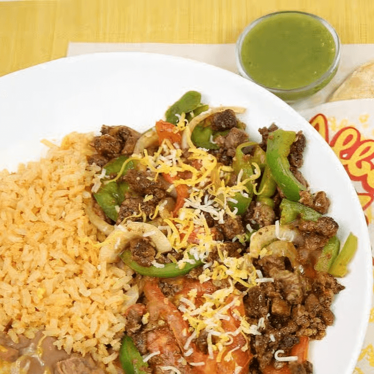 Sheared beef and vegetables. Enchilada sauce, cheese, lettuce, and pico de gallo. Served with rice and beans.