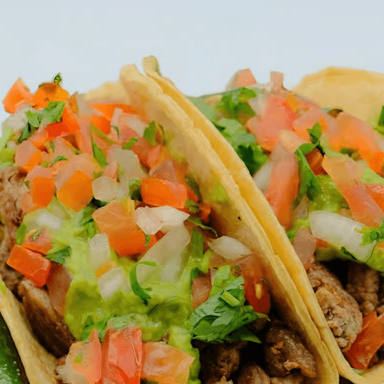 Delicious marinated pork (al pastor style) with cheese, pico de gallo, and guacamole, accompanied by beans and rice, and flour or corn tortillas